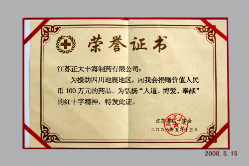 四川阿坝州汶川县发生7.8级特别重大地震灾害后,正大丰海度关注灾情。一方有难,八方支援,灾区人民现在急需各类药品,我们应主动伸出援助之手,献一份爱心,送一丝暖意。公司紧急调集灾区急需的药品,这些药品包括治疗用药罗红霉素胶囊、加替沙星输液、甘油果糖输液,代血浆右旋糖40输液,能量补充剂果糖输液和氨基酸输液等灾区急需的药品,总价值100万元,无偿捐赠给汶川灾区人民,支持灾区人民渡过难关。