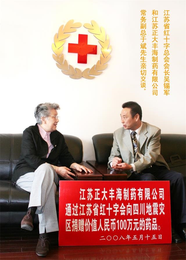 5月15日,江苏省红十字会会长吴锡军,在宁亲切接见了代表公司捐赠药品的正大丰海制药有限公司党委书记、常务副总经理于斌一行,吴锡军对正大丰海全体员工的义举给予高度评价,向他们颁发了荣誉证书和印有红十字精神“人道、博爱、奉献”的牌匾。